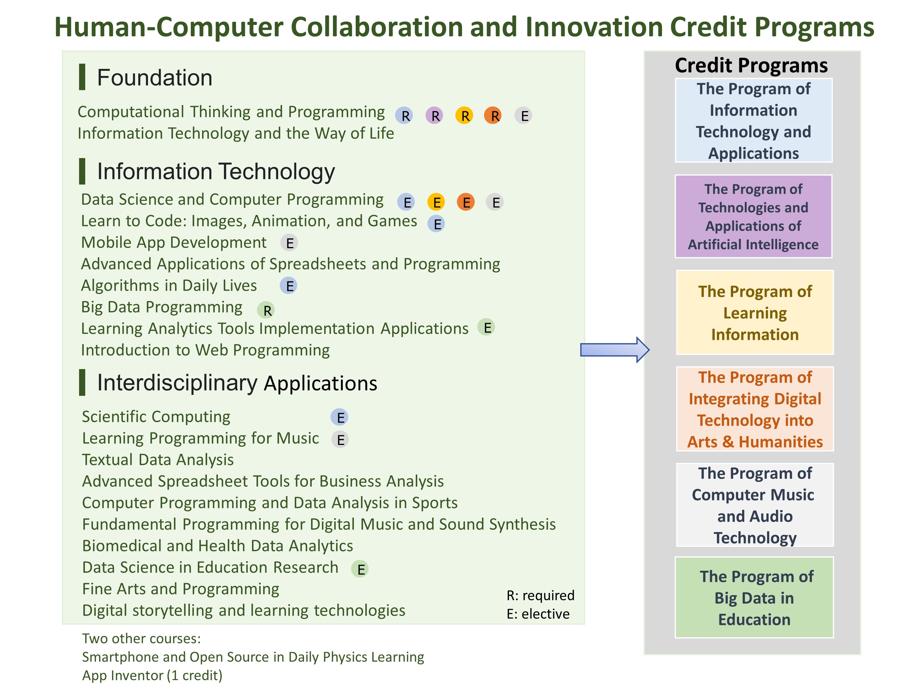 | Foundation | Computational Thinking and Programming | Using information technologies to solve problems is an important skill in today's workplace. High-level workers often need to design a series of instructions to use information tools or make information equipment operate automatically according to needs. To have this ability, you need to have a good "computational thinking". Through group unplugged activities, this course will learn how to apply computational thinking to solve problems (without the use of information equipment), and then learn basic program/command design skills through visual programming tools. Finally, let group make multimedia project, to make sure they can apply "computational thinking skill". Those who complete this course will have the foundation to develop information application software (such as APP application software) and information application system (such as the Internet of Things). |