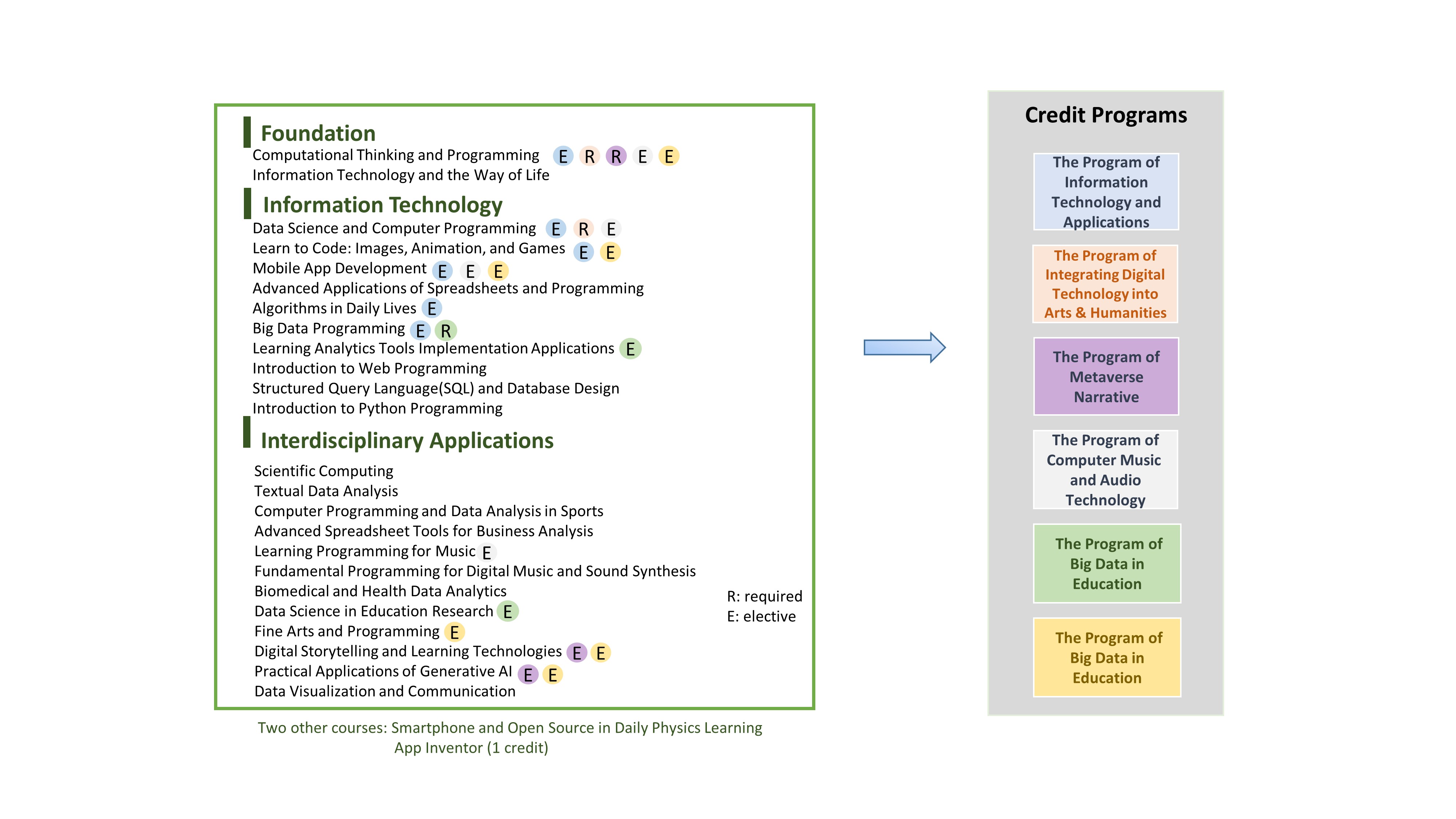 | Mobile App Development | This course aims to teach students to develop mobile applications through MIT App Inventor, a visual programming language. Students who intend to enroll in this course are suggested to have basic programming skills and know basic programming concepts such as variables, selection, and loops. (Those who need to learn basic programming skills are encouraged to enroll in another general education course - "Computational Thinking and Programming".) | |